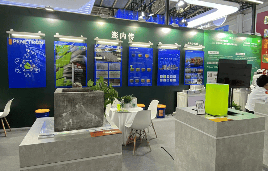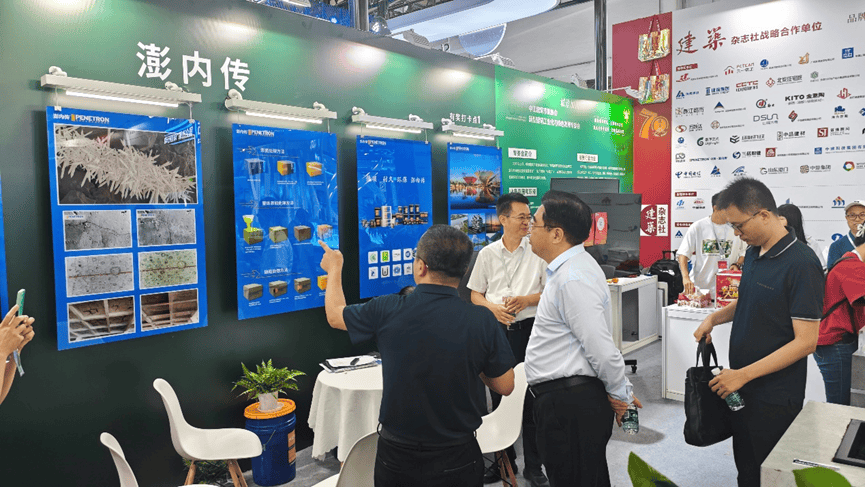 北京澎內傳公司展出了全球領先的混凝土滲透結晶自愈合技術以及系統產品,展板上生動形象的展現出滲透結晶的技術原理、電鏡下的結晶形貌和實效工程照片等;實物水池模型與試塊直觀地看到結晶自愈合后的功效。澎內傳先進的滲透結晶科技不僅能從根本上解決混凝土結構的滲漏水頑疾,還能提高混凝土整體的耐久性,延長結構的使用壽命60年。產品低碳環保,為我國造就高質量建筑和可持續發展的目標提供堅實的技術基礎和科學的安全保障,更好的滿足人們對好房子的需求。